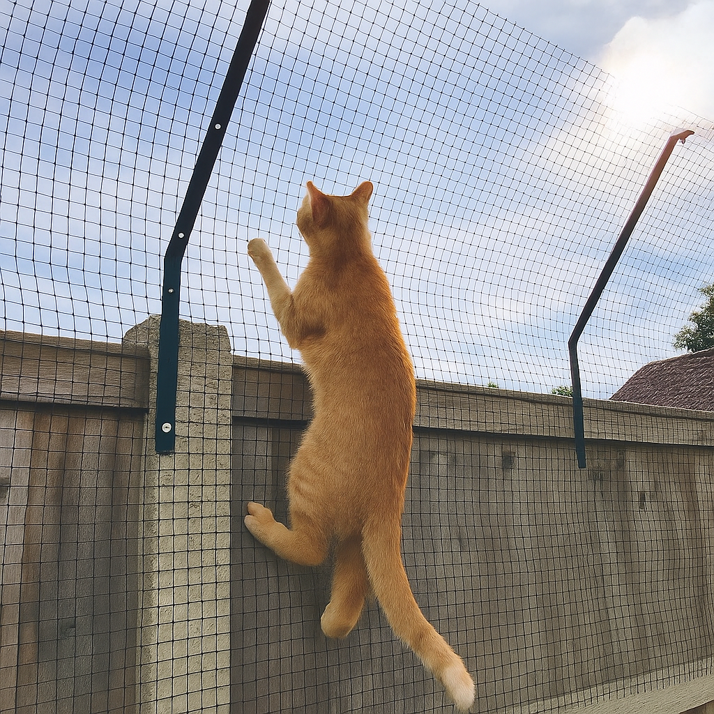 A cat fence is a barrier system designed to keep your cat safe within your garden or outdoor space. Our kits are specially designed to prevent cats from climbing or jumping over by using brackets that allow an overhang net that deter escape without harming your pet.